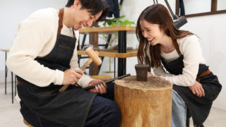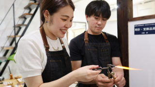ふたりで手作りする結婚指輪。ゴールド地金からの制作です。ゴールドは硬く、正円を出すのに時間がかかります。最初から力いっぱい指輪を木槌で叩くとロー付け(溶接)部分が外れてしまいます。「こんなにきれいな丸になるんだね、最初の棒の姿が思い出せないくらい」まん丸の指輪に仕上がりました。